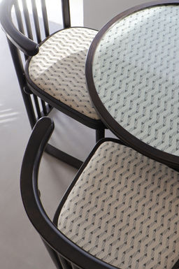 Stained black beech wood; pattern fabric; glass and brass plate (chair)