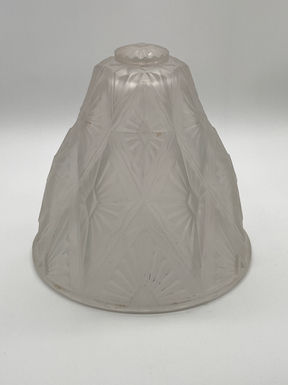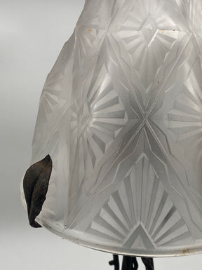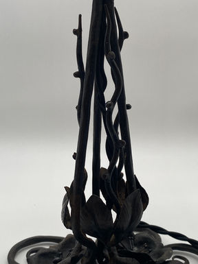 In francophone late Art Nouveau style, the base of the lamp is adorned with delicately sculpted leaves and flowers, while its stems transition fluidly into the body of the lamp displaying punctuated thorns. The intricate juxtaposition of the organic body's structure and geometric motifs of lampshade render this design a notable transition piece.