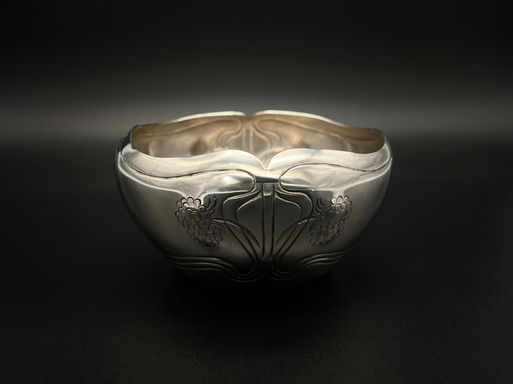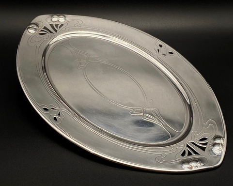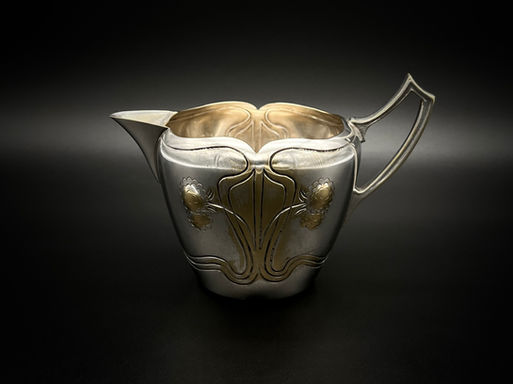 Three-piece coffee set, composed by a tray, milk jug and sugar bowl from the 1900s. Its “whiplash” motif, in the manner of Hermann Obrist’s 1895 design, is characteristic of the francophone Art Nouveau, differing from the germanophile Jugendstil